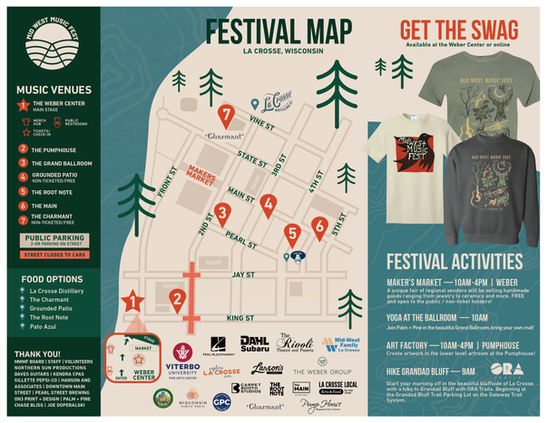 For over 15 years, MWMF has hosted over 60+ artists each year at an annual festival across several stages in downtown Winona. As Creative Director I executed a full rebranding of the non-profit including website design, expanding an existing logo, signage, marketing material, and merchandise.